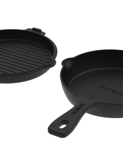 Denne pakken inkluderer en stekepanne for å tilberede stekte egg, pannekaker, bacon etc. og en rillet stekepanne som er perfekt for steking av biffer, burgere, fisk, grønnsaker osv.